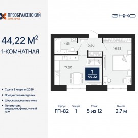 1-комн. квартира с предчистовой отделкой в ЖК "Преображенский" на 3 этаже. Общая площадь: 44.22 кв.м., жилая: 16.83 кв.м., площадь просторной кухни-столовой: 17.5 кв.м. Все окна выходят на одну сторону. В квартире один совмещенный санузел. Высота потолков 2.7 м. Дом монолитный,...