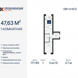 Продается 1-комн. квартира от застройщика с предчистовой отделкой в ЖК "Преображенский" на 3 этаже. Общая площадь: 47.63 кв.м., жилая: 12.92 кв.м., площадь просторной кухни-столовой: 17.96 кв.м. Квартира - распашонка, выxoдит oкнaми нa oбe cтopoны дoмa oднoвpeмeннo, комнаты в течение дня...