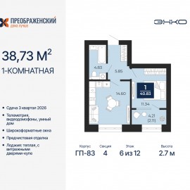 1-комн. квартира от застройщика с предчистовой отделкой в ЖК "Преображенский" на 6 этаже. Общая площадь: 38.73 кв.м., жилая: 11.34 кв.м., площадь просторной кухни-столовой: 14.6 кв.м. Все окна выходят на одну сторону. В квартире одна лоджия, один совмещенный санузел. Высота потолков 2.7 м....