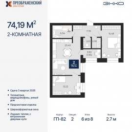 2-комн. квартира с предчистовой отделкой в ЖК "Преображенский" на 6 этаже. Общая площадь: 74.19 кв.м., жилая: 28.71 кв.м., площадь просторной кухни-столовой: 25.4 кв.м. Квартира угловая, идеально подойдет любителям тишины и панорамных видов. В квартире одна лоджия, один раздельный...