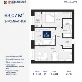 Продается двухкомнатная квартира с предчистовой отделкой в ЖК "Преображенский" на 4 этаже. Общая площадь: 63.07 кв.м., жилая: 26.76 кв.м., площадь просторной кухни-столовой: 20.57 кв.м. Комнаты изолированные, все окна выходят на одну сторону. В квартире одна лоджия, один совмещенный...