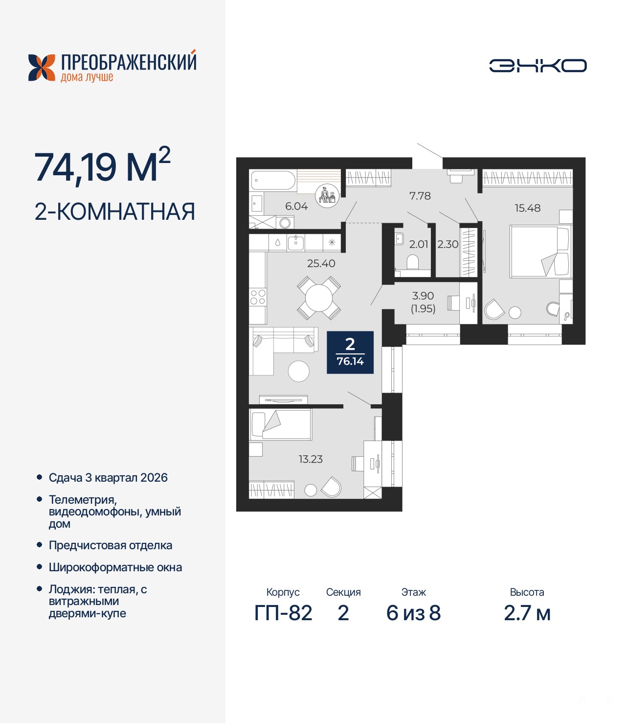 2-комн. квартира с предчистовой отделкой в ЖК "Преображенский" на 6 этаже. Общая площадь: 74.19 кв.м., жилая: 28.71 кв.м., площадь просторной кухни-столовой: 25.4 кв.м. Квартира угловая, идеально подойдет любителям тишины и панорамных видов. В квартире одна лоджия, один раздельный санузел. Высота потолков 2.7 м.