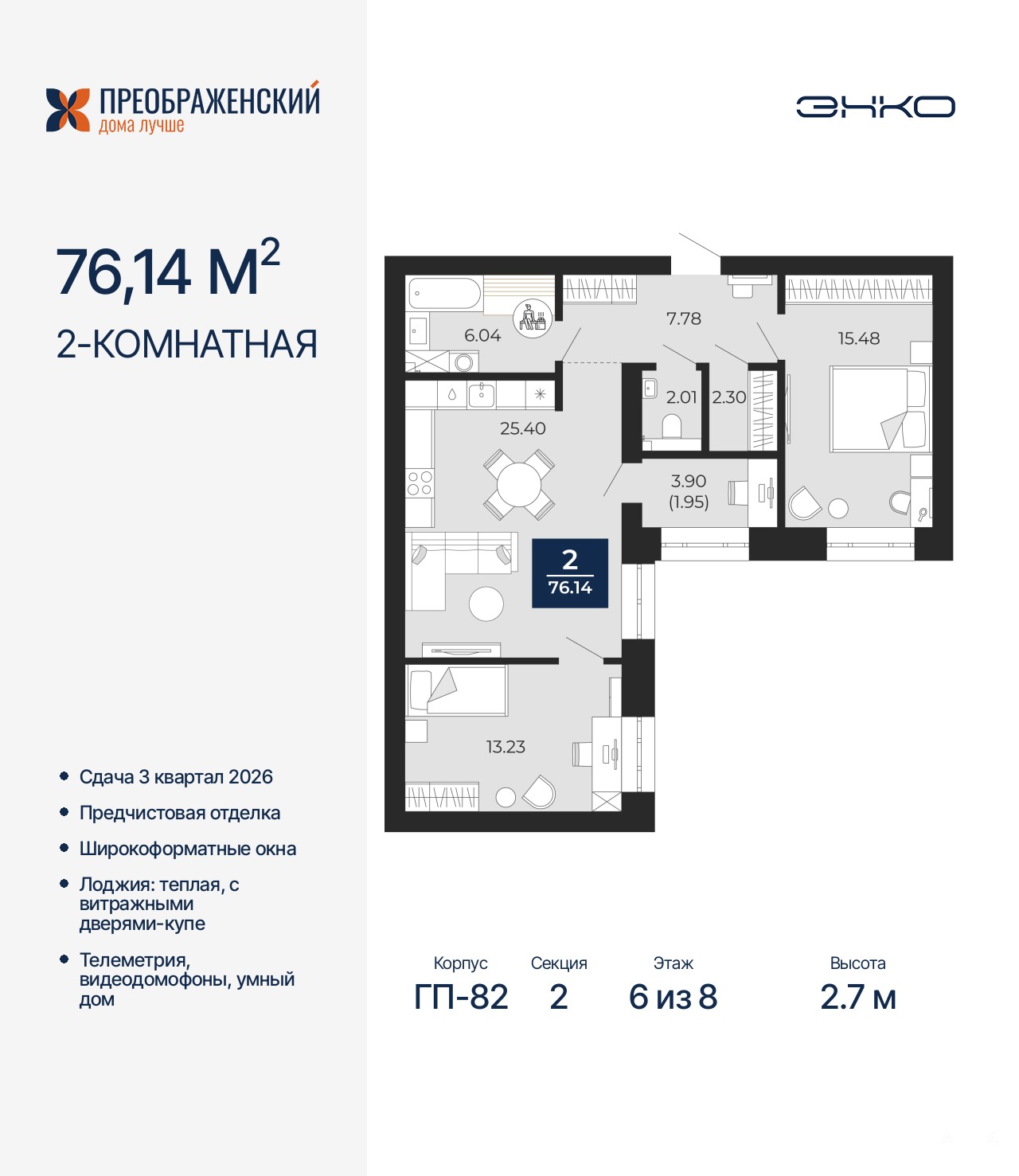 Продается двухкомнатная квартира с предчистовой отделкой в ЖК "Преображенский" на 6 этаже. Общая площадь: 76.14 кв.м., жилая: 28.71 кв.м., площадь просторной кухни-столовой: 25.4 кв.м. Угловая квартира, идеально подойдет любителям тишины и панорамных видов. В квартире одна лоджия, один раздельный санузел. Высота потолков 2.7 м.