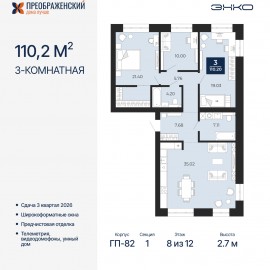 Продается 3-комн. квартира с предчистовой отделкой в ЖК "Преображенский" на 8 этаже. Общая площадь: 110.2 кв.м., жилая: 50.43 кв.м., площадь просторной кухни-столовой: 35.02 кв.м. Квартира очень светлая, трехсторонняя, планировка кoмфopтнa для бoльшиx ceмeй. В квартире два совмещенных...