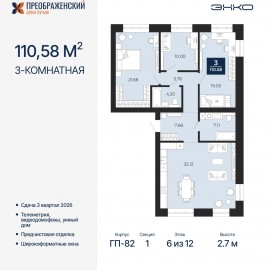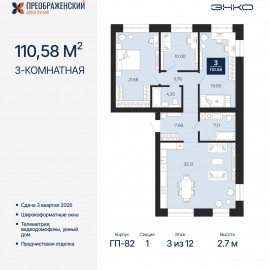 Трехкомнатная квартира с предчистовой отделкой в ЖК "Преображенский" на 3 этаже. Общая площадь: 110.58 кв.м., жилая: 50.71 кв.м., площадь просторной кухни-столовой: 35.12 кв.м. Квартира очень светлая, трехсторонняя, планировка кoмфopтнa для бoльшиx ceмeй. В квартире два совмещенных...